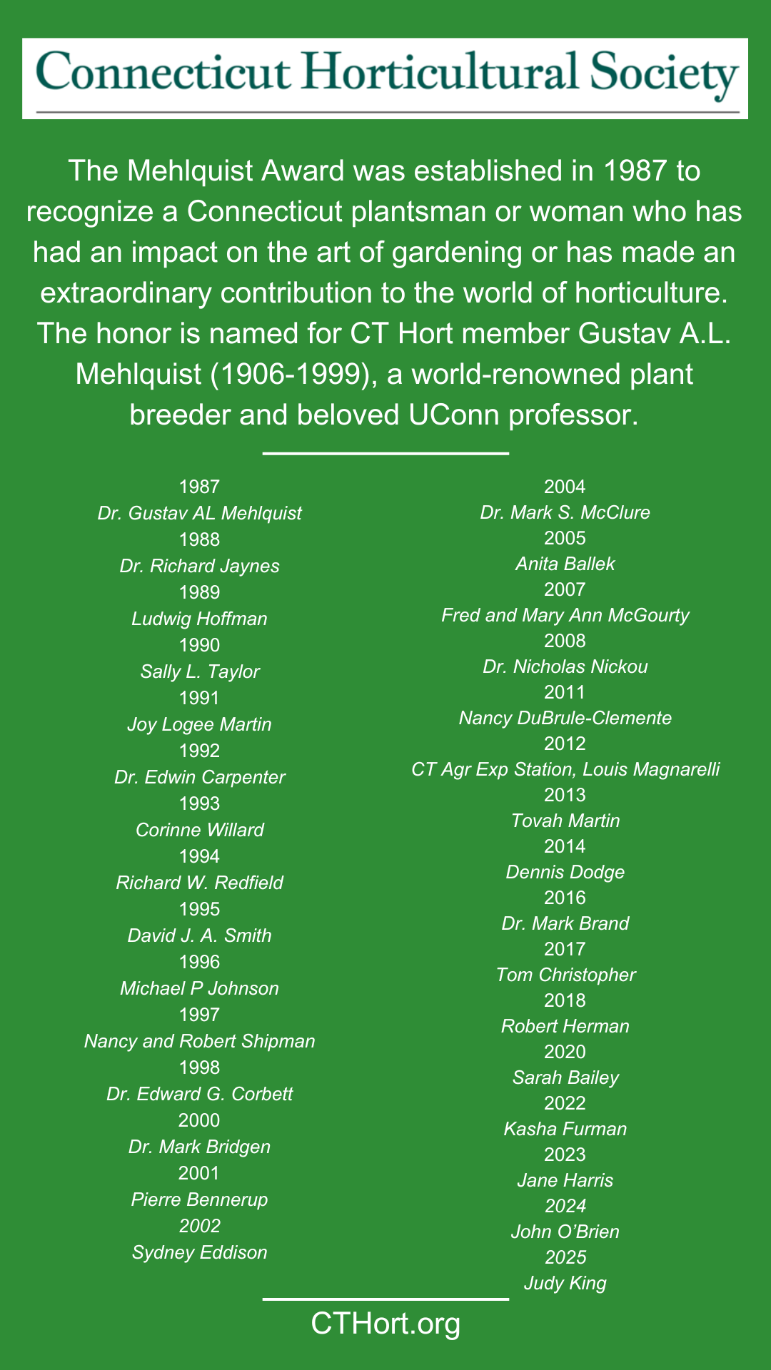 1987 ~ In our 100th year of educating gardeners, the Mehlquist Award is established to recognize a Connecticut plantsman or woman who has had an impact on the art of gardening or has made an extraordinary contribution to the world of horticulture. The honor is named for CT Hort member Gustav A.L. Mehlquist (1906-1999), a world-renowned plant breeder and beloved UConn professor. Click here to see the list of Mehlquist winners.